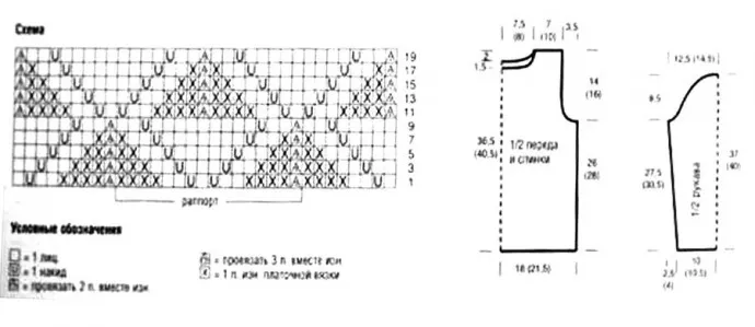 Ажурный узор: число петель кратно 16+1+2кром. Вязать по схеме, на которой приведены только лиц. р., в изн. р. петли вязать по рисунку или как обозначено, накиды вязать изн.Начинать с 1 кром. и петель перед раппортом, повторять раппорт, заканчивать петлями после раппорта и 1 кром. Повторять с 1-го по 20-й р.