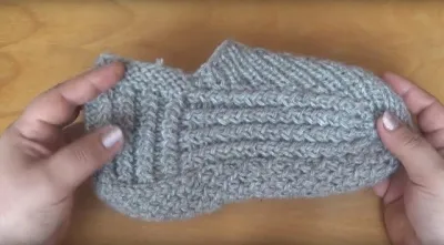 Добираем петли по боковым сторонам пятки и вяжем далее как показано на видео на длину подошвы.