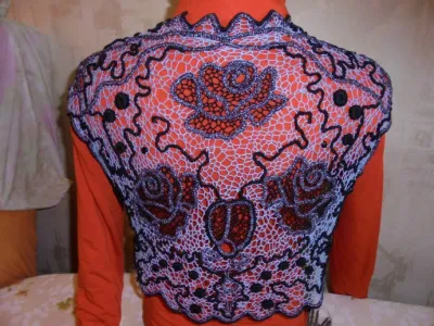 Доброго всем времени суток. Одна из моих давнишних работ. Пряжа вискоза. Метраж 400м в 100г. Для сеточки метраж 700м в 100г. Болерушка выполнена в технике ирландского кружева. Все крупные элементы выложены из шнура гусенички. Также ягодки и небольшие шнуры на бурдоне. Всё соединила хаотичной сеточкой.