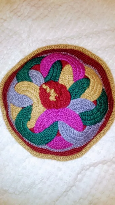 Не всякого. Пуловер вряд ли получится. Хотя тоже не факт. А вот коврики, наволочки для подушек, пледы ,подставки под горячее, салфетки и многое другое - запросто. Все зависит от задумки и толщины нити. Собственно, вяжутся кольца и переплетаются наподобие олимпийских. Хитрость в том, чтобы внутренний диаметр кольца соответствовал его ширине. Все! Нанизывайте кольца как угодно, комбинируйте цвета. В качестве примера вот подушка и салфетка под горячее.