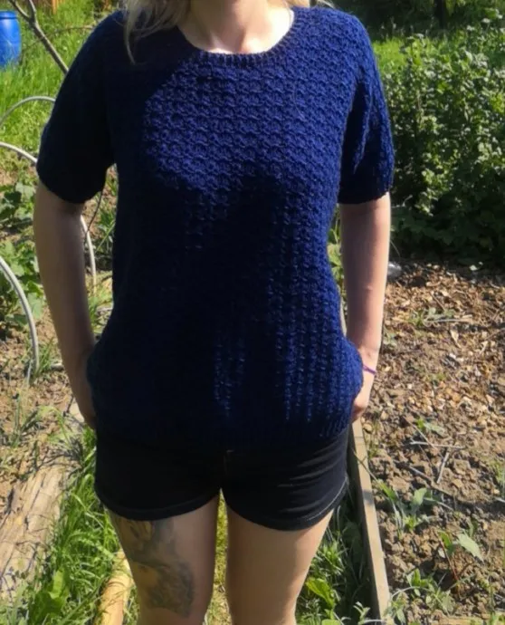 И снова здравствуйте! С пылу, с жару, прямо с моего ручного конвейера появился джемпер. Ниточки - прелесть просто Sofit, состав 45% шерсть, 55% шёлк. Реально шелковистая, цвет густо-синий, на солнышке синий цвет словно светлее становится. Правда, для меня, как вязальщицы - спицами вязать их было не очень удобно - тонковато, попробовала несколько узоров и отказалась - не полотно, а решето текучее. Взяла крючок и заиграли нитки новыми узорами! Жаль, что крючок берет гораздо больше пряжи, чем у меня было, поэтому план вязания джемпера с длинным рукавом изменился. Короче, от задуманного полноценного джемпера с длинным рукавом спицами, остались только нитки.