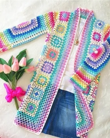 Разноцветный кардиган, в основе которого бабушкин квадрат!
