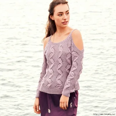 Джемпер реглан впечатляет не только сочетанием патентных петель и зигзагообразных «кос». Вырезы на плечах смотрятся изысканно и очень соблазнительно!