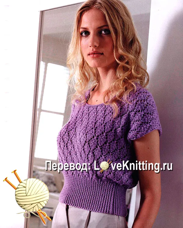 Кружевной летний пуловер от Debbie Bliss с элементами винтажного стиля снизу выполнен лицевой скрещенной резинкой 1 х 1. Верхняя часть тела имеет классический кружевной узор.