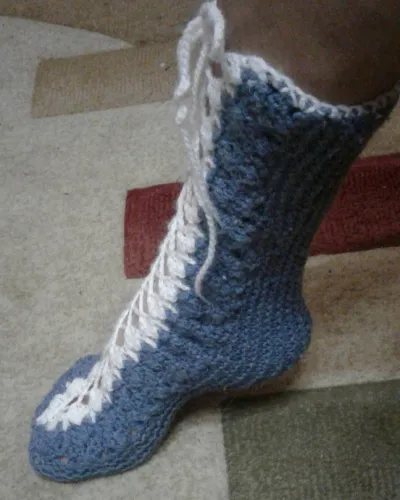 Вяжем прямоугольное полотно , объвязываем крючком, до нужной ширины ступни, длиные края. Одну боковую часть стягиваем шнурком и зашнуровываем длиные края.