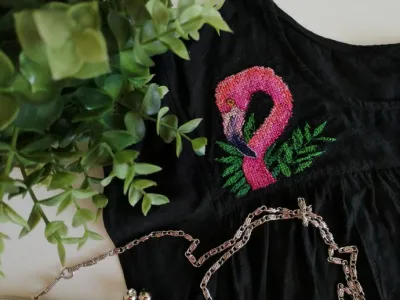Всего за 3 дня неспешным темпом я вышила фламингушку на простенькой черной блузке, на себе мне пока некому сфоткать, поэтому исхожу из того, что есть.
