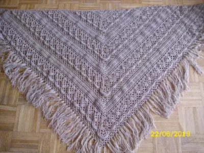 Ушло 400 гр пряжи . Чистая шерсть . Размах одного крыла 107 см , от центра вниз 100 см . Крючок 3,5 . 2 недели ушло на работу .