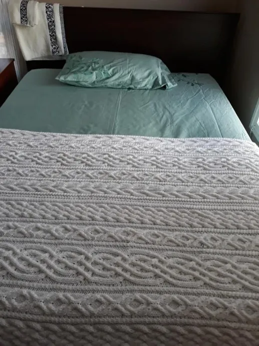 Это был вязальный запой, когда у меня была идея фикс, связать комплект на кровать в технике аранских узоров. Вязала я его 4 мес с июля по октябрь...Так как в Испании нет отопления в квартирах, он мне очень пригодился и в комплекте на кровати смотрится очень эффектно...