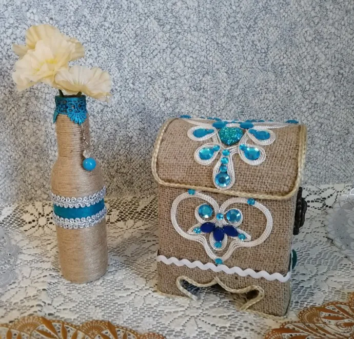 Вот сразу видно, что комментарий получен от творческого человека. У большинства людей ассоциации с сундуком- это драгоценности. Мозг рукодельниц устроен совершенно по другому. Отвечу на вопрос. Тут и джут и мешковина и тесьма, косичка на отделке края вообще из старого театрального парика, я отстригаю эти косички и использую как элементы декора. Также я люблю использовать камни и стразы. Очень рада вашему любопытству.