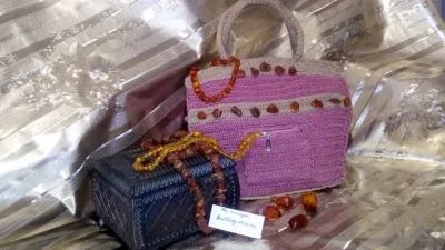 Подкладка пришита, наступил самый сладкий момент прикрепления кусочков янтаря, этих солнечных то ли слез, то ли брызг, то ли осколков солнца... Что из этого вышло - смотрите на фото. Теперь тепло древнего солнца всегда со мной! И все мои дамские (и не дамские) мелочи разместятся по своим местам.