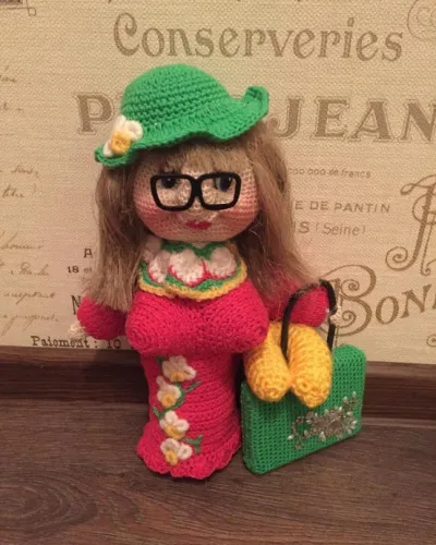 Образ куклы возник спонтанно,дочь все путешествует вот и решила связать ей куклу.Вот что получилось,она конечно немного комична но образ чемоданного настроения присутствует.