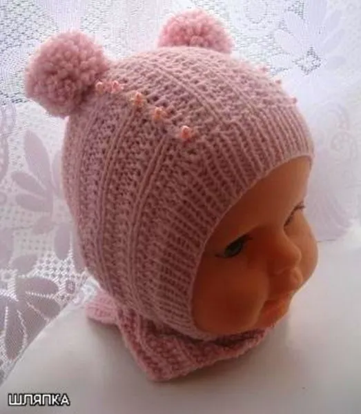 набрать 50 петель и вязать резинкой 2 на 2 30 рядов ( перед ) , петли отложить . Затем также свять на 50 петлях вторую деталь , но уже чуть длиннее 40 рядов ( спинка ) , далее обе детали замкнуть в круг и вязать по кругу 30 рядов . На передней половинке закрываем средние 18 петель и продолжаем вязание , закрывая с каждой стороны в каждом втором ряду по 2 петли 5 раз, должно остаться в работе 62 петли и вяжем высоту нашей шапочки ( примерно 15 см ) и потом , делим на три части 20 , 22, 20 петель и вяжем как пятку носка , должны на спице остаться 22 петли , затем вяжем резиночку по овалу лица 10 рядов . Сделать помпончики и пришить пуговки .
