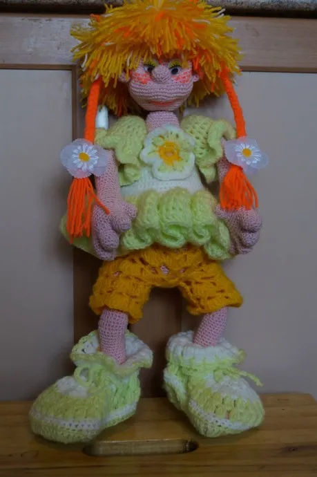 Много лет назад записала просто для себя схему вязания куклы. Вязана из Пехорока "Детская новинка", акрил 100%, 200м 50г. Рост 50см, расход пряжи на куклу без одежды 100г.