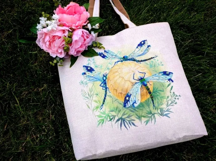 У меня была заготовка сумки, внутри нее не зашита подкладка, чтобы было удобно вышивать. Комплект бисера, бусин разных размеров, страз - все это прилагалось. Фоновый рисунок был уже нанесен на сумку, нужно было только сверяться со схемой и вышивать в нужных местах.