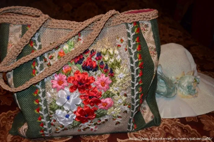 Люблю вышивать на мешковине , так как очень удобный материал. Нравится комбинация грубой ткани и атласных лент. Сумки все выполнены из мешковины разного цвета. Цетнральная часть вышита атласными лентами разного размера. Ручки и края сделаны крючком из веревок для макраме.