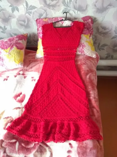 Нитки: Семеновская пряжа, 400м/100г, 47% хлопок, 53% вискоза, крючок 3 мм., пряжи ушло около 5 мотков. Цвет на фото очень яркий. на самом деле цвет платья классический красный.