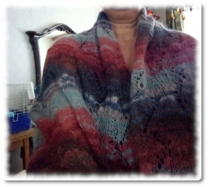 Разноцветный кидмохер очень пригодился.связала шарфик на зиму..не носила даже ни разу.Спицы-1.5 мм.Вязала по схеме ажурной шали.