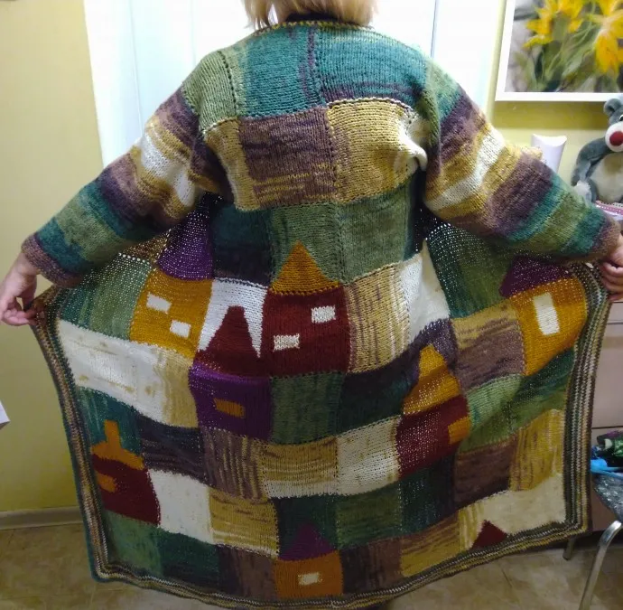 Пальто связано квадратами из пряжи Суперлана Батик Ализе по мотивам работ Анны Лесниковой, ушло около 700 гр.