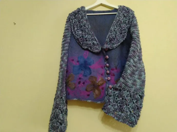 Валяю много вещей, но пришла к выводу, что в валянных вещах рукава - это проблема: они заминаются, редко садятся хорошо (это особенности моей фигуры). И тогда я стала вывязывать рукава, кроме этого, стала использовать вязание, как обработку края изделия.Представляю несколько работ. Извиняюсь за не очень качественные фото!