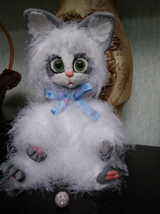 Лапки, мордочка, ушки из запекаемой полимерной глины. Пряжу не могу вам назвать, принесли родители в детский сад без этикетки, но сказали что покупали в Леонардо по 200р за моток, не нашли применения и отдарили мне.