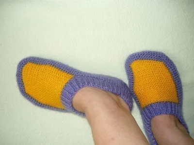 2. набрать с боков 21 петлю и вяжем основным цветом 14 рядов платочной вязкой(глубина башмака)