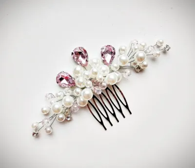 1. Гребень для волос "Жемчужный". Прекрасный,нежный и очень нарядный гребешок для причёски выполнен в технике плетение из проволоки. В работе использованы бусины под жемчуг разных размеров, стеклянные граненые бусины светло-розового оттенка,сверкающие стразы белого цвета (мелкие) и крупные сияющие стразы розового цвета. Гребень подойдёт как для создания свадебной прически,так и для дополнения вечернего образа. Стразы и стеклянные бусины искрятся и разбавляют мягкое сияние жемчужных бусинок, гребень смотрится невероятно нежно и красиво! Стоимость гребешка 800 рублей.