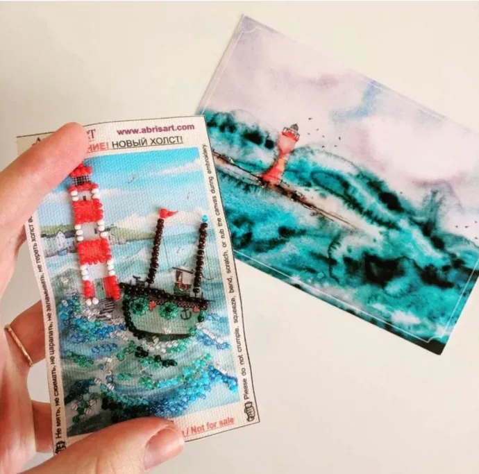 Я решила не терять время даром и вышила его. Получился холстик с фрагментом бушующего моря, маленького кораблика и яркого маяка!