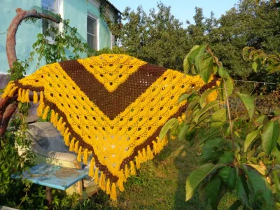 Богатая шаль получилась! Цвета шикарно подобрали! Фото «на прищепочках»обалденное: осень, подсолнухи, красота!