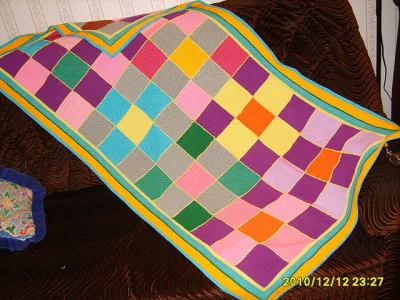 Такой яркий позитивный плед!!! Только не смогла рассмотреть способ вязки квадратов