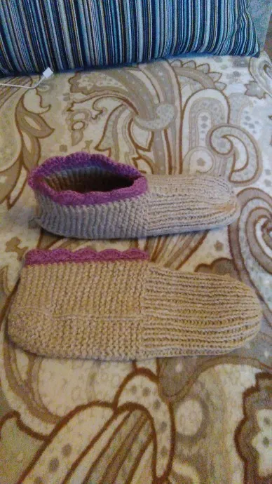 Увидела в нете очень простые в исполнении следки, покопалась в своих закромах, нашлись иточки от распоротой кофты (очень хорошая кофта была, индийская, еще с времен СССР), шерстяные, кофейного цвета с эффектом меланжа. Решила их использовать на следки, навязала несколько пар, раздарила почти все. Вяжутся на двух спицах одним полотном начиная с задника и до носка. Задник платочной вязкой, потом резинкой 1 * 1 с убавками в конце. Потом задник сшивается, а носочек собирается в кучу. Ну и обвязка по краю по желанию.