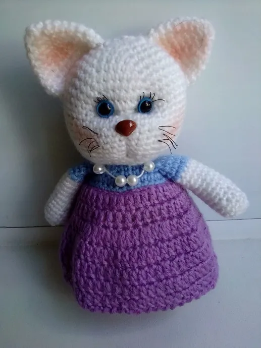 Доброго времени суток, дорогие рукодельницы! На конец довязала эту симпатичную кошечку. Теперь даже не помню по какому МК вязала. Оставалось только связать наряд. Связала простенькую юбчонку, сделала бусики И выставляю на ваше обсуждение.