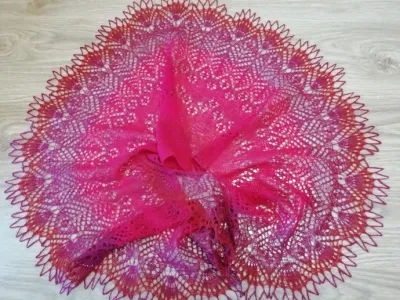 Очень красивая шаль! Легкая, нежная, теплая, люблю Кауни. Удачи в конкурсе!