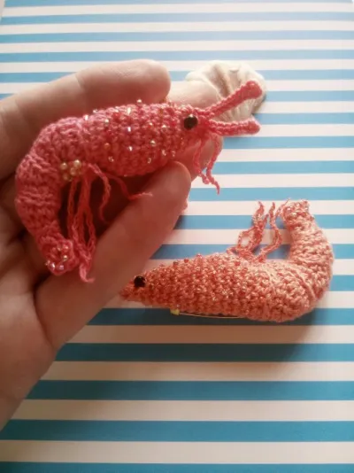 Брошь выполнена крючком из хлопковой пряжи,украшена бисером. Необычный стильный аксессуар. Авторская работа, выполнена с любовью и настроением. Такая брошь прекрасно смотрится и на джинсовой куртке, и ка трикотажном свитере. Размер "креветок" около 7 см, "королевской" 10 см.