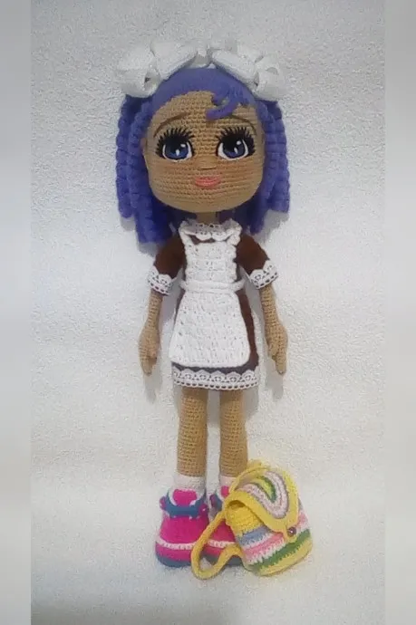 Связана из пряжи " Бисерная" . рост 45 см. Имеется шейный фиксатор чтоб голова держала и гнулась. Платье не снимается а обувь снимается.