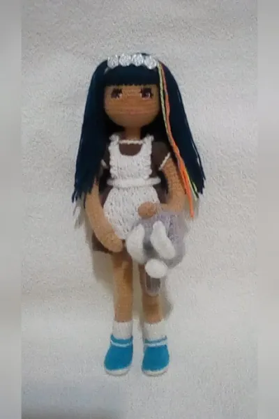 Связана из пряжи " Бисерная" . рост 23 см. Имеется проволочный скелет ( гнется вся). Платье не снимается а обувь снимается.