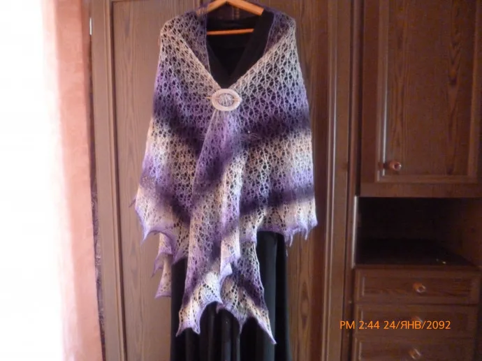 Колючеватая для чувствительных. Но многие могут носить и на голое тело. На шаль, в зависимости от рисунка и размера нужно от 120 до 160 — при толщине нити 800м/100 г. Продается такая нить и толщиной 400м/100 г. Но тонкая смотрится изящнее. Не ошибитесь. Пряжа продается в пасмах, все пасмы разного веса. Грязные. Я ее сначала стираю шампунем в пасмах, сушу, перематываю в клубочки, чтобы вязать изнутри клубочка. Пряжа совершенно не линяет. Всегда очень гармоничной расцветки. Именно этот цвет называется Томас.