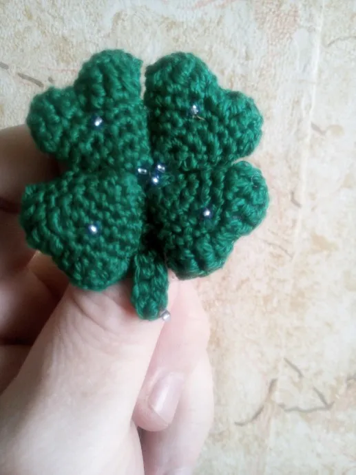 Не нашли на лугу листочек клевера с 4-мя лепестками? Я его связала, удача будет всегда с Вами. Брошь связана из хлопковой пряжи, размер 4-5 см. Вариант без бисера прекрасно подходит и для мужчин. Могу связать такой листочки разного цвета.