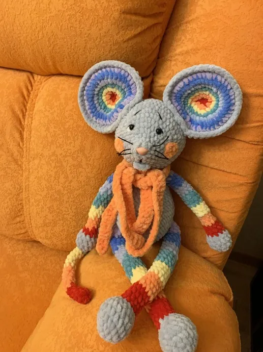 Из плюшевой пряжи серого цвета, цветная -остатки, от разных игрушек, аналогично -плюшевая. Радужная часть вяжется крючком -2, а сама мышка 3,5. В ручки и ножки можно вставить магниты , будут держаться везде. Наполнитель синтепух. Шарфик связан из цепочки -80 воздушных петель , один ряд столбиками без накида