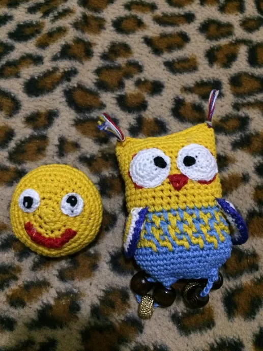 В начале октября в нашей семье ожидается пополнение. Вот для внучки и связались эти игрушки-погремушки. Внутри совушки яйцо от Киндер сюрприза с бисером, в яйце я сделала несколько дырочек, чтобы после стирки вода в яйце не тухла. А в смайлике баночка от M&M, её я проклеила клеевым пистолетом, там тоже бисер, так как баночка из крепкого пластика. По крайней мере старшенькому эти погремушки очень понравились, пока себе забрал. Мне самой очень понравилось вязать погремушки, теперь не буду выкидывать яйца от Киндеров. Спасибо за просмотр.