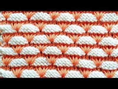 6 ряд. оранж.нить * 4 лиц., 1 лиц. вытяговаем из нижней петли на 4 ряда ниже, на границе с оранжевым рядом,1 лиц., 1 лиц вытягиваем из той же петли, что и предыдущую, 1 лиц.,1 лиц вытягиваем из той же петли где и предыдущие вытянутые петли.*