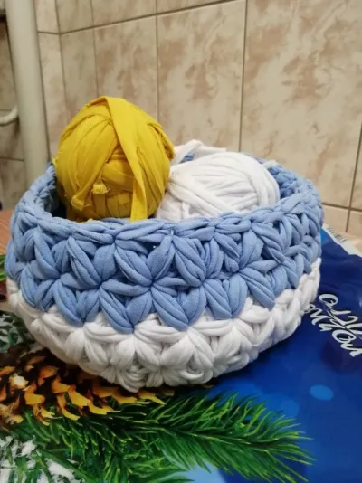 Так понравилось работать трикотажной пряжой, вот решила связать ещё корзину для пряжи