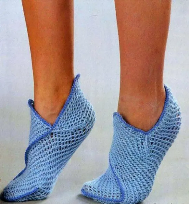 Набрать на спицы 17 п. и вязать платочной вязкой = 7,5 см. Затем с одного края добрать 33 п. и вязать еще 7,5 см. Далее закрыть 17 п. с той стороны, где добирали петли, а с другой стороны добрать 17 п. и вязать еще 7,5 см. Закрыть все петли. Сложить получившуюся деталь, как показано на рисунках. Обвязать тапочки синей нитью ст. б/н.