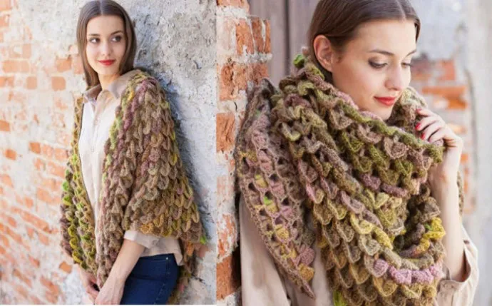 Плотность вязания: чешуйчатый узор — 8 р. = 10 см, 2 чешуйки = ширина 10 см.