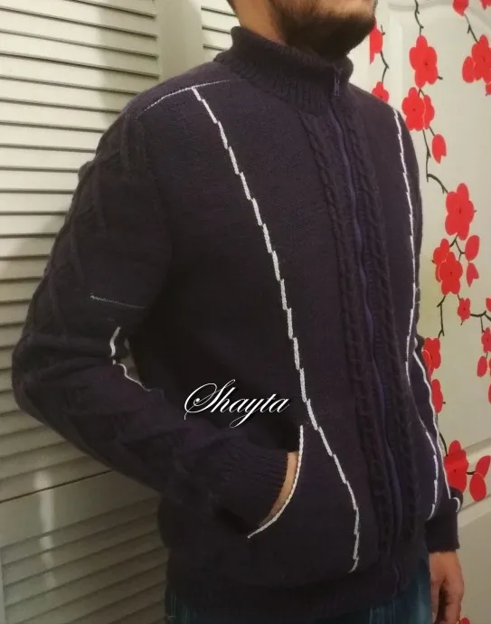 Здравствуйте рукодельницы и мастерицы!Авторский жакет на молнии связан в две нити из замечательной пряжи ;Бриллиант" в 100 гр - 380 м,, шерсть - 45%(ластер),акрил - 55 %,размер 50 -52 .Использовала 2 упаковки,ровно 1 кг .Он связан снизу,одновременно спинка и полочки,На полочках вывязаны - вначале внешняя часть карманов,затем внутренняя(набранная от резинки -вновь),и затем в верхней части уже соединила обе и продолжила.Плечевые швы-методом 3х спиц.Рукава- сверху вниз,имитация втачного.Белые полоски вязала сразу,на карманах - там вязала на готовом изделии крючком . На фото цвет молнии искажается,а цвет жакета тот,где насыщенный ,тёмный.