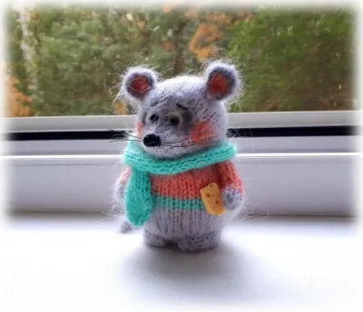 Мышонок связан спицами вкруговую. Основу головы брала из мк маленьких мышек в свободном доступе инета. Немного переработала.