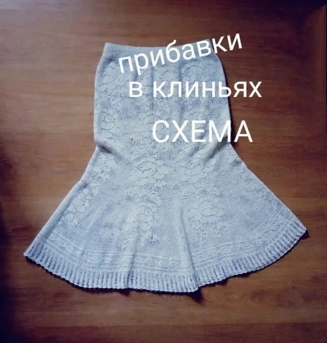 Юбка-шестиклинка связана филейным кружевом по кругу сверху вниз. Прибавки в каждом пятом ряду.