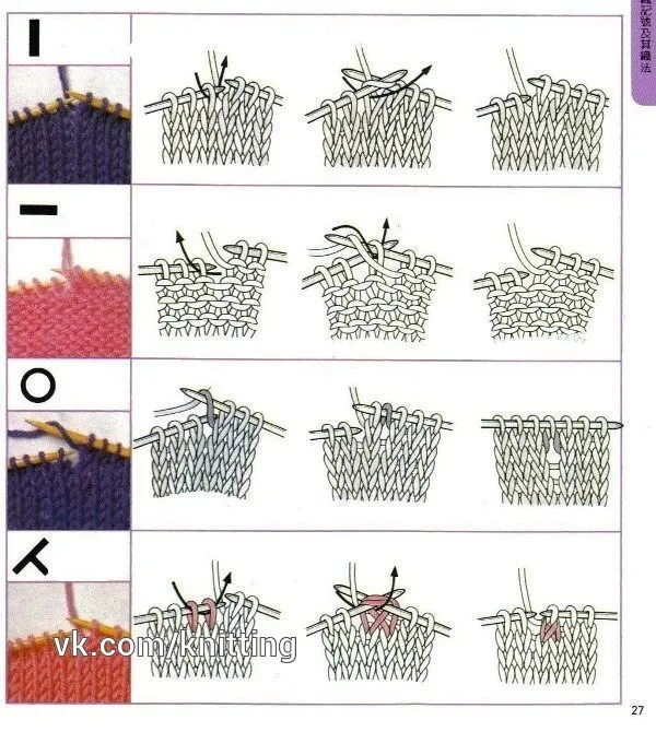 I - лицевая — - изнаночная O - накид \ - 1 протяжка (1 петлю снять, следующую петлю провязать лицевой и протянуть через нее снятую петлю) / - 2 вместе лицевой ~ - 2 вместе изнаночной ^ - 2 вместе изн...