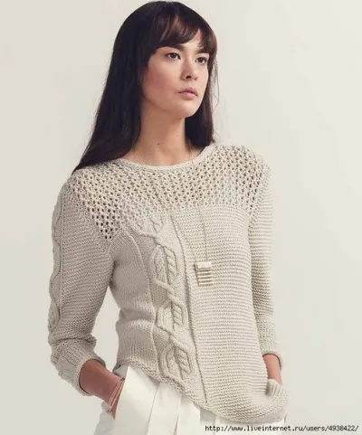 Перед и спинка пуловера выполняются отдельно прямыми и обратными рядами снизу вверх, а затем сшиваются. Рукава вяжутся сверху вниз.