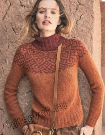 Модная модель женского вязаного свитера с круглой жаккардовой кокеткой спицами