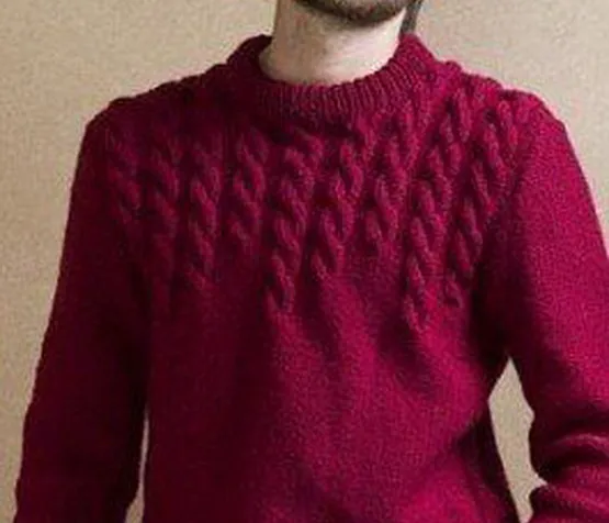 Свитер связан из пряжи бордового цвета. Описание вязания свитера для мужчин приведено для следующих размеров S/M/L/XL/XXL. Манжеты рукавов, воротник и низ свитера связаны резинкой один на один.
